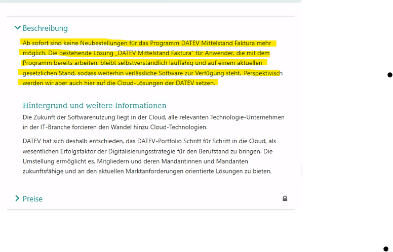 Ich bin über einen Hinweis der DATEV gestolpert, der auf der Produktseite von Mittelstand Faktura angezeigt wird (gekürzt): „Ab sofort sind keine Neubestellungen für das Programm DATEV Mittelstand Faktura mehr möglich. Die bestehende Lösung … bleibt selbstverständlich lauffähig …, sodass weiterhin verlässliche Software zur Verfügung steht. Perspektivisch werden wir … auf die Cloud-Lösungen setzen.